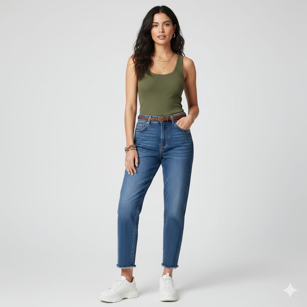 Adopta el estilo retro con nuestro Jean Mom «Silueta Relajada». Este pantalón de mezclilla de tiro alto y corte más holgado en la cadera que se estrecha ligeramente hacia el tobillo ofrece un confort superior y un look auténticamente vintage. El bajo deshilachado añade un toque moderno y desenfadado.