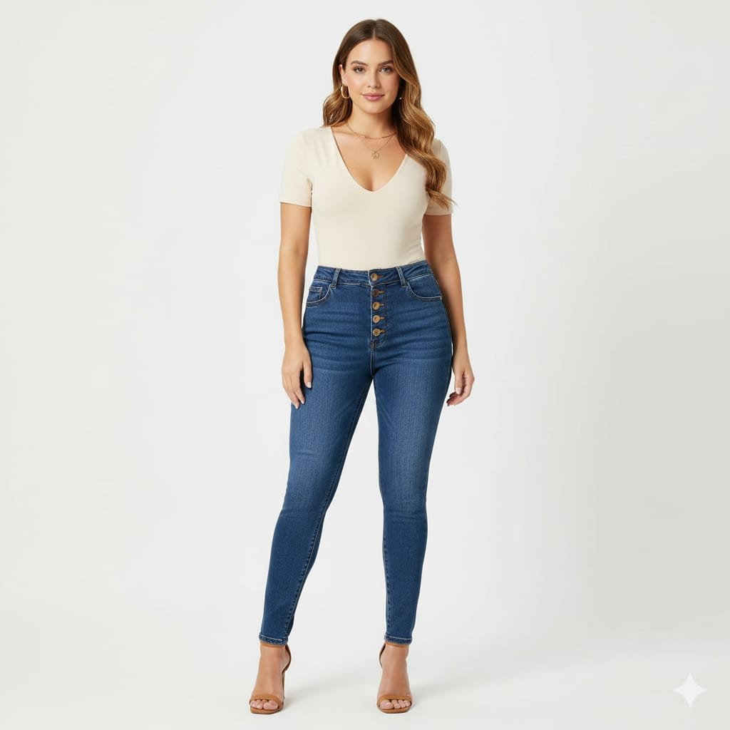 Realza tu silueta con nuestro Jean Skinny «Botones Dorados». Este pantalón de mezclilla de tiro alto y corte ajustado se adapta perfectamente al cuerpo, ofreciendo un ajuste favorecedor. Los distintivos botones dorados en la cintura añaden un toque chic y moderno, elevando un clásico del denim.
