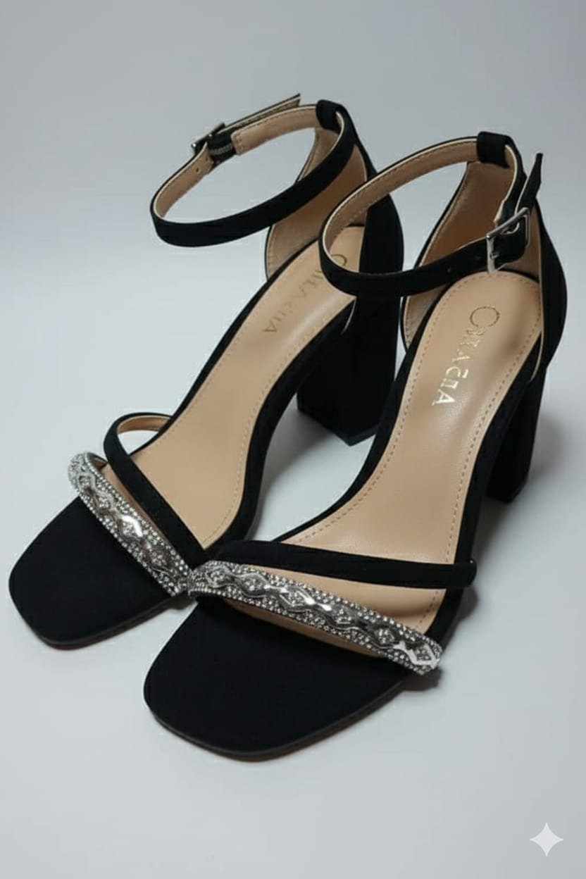 Elegancia atemporal y un toque de glamour se unen en nuestras Sandalias «Noche de Gala». Confeccionadas en un sofisticado color negro y adornadas con una deslumbrante tira de pedrería, estas sandalias de tacón bloque son el complemento perfecto para cualquier evento especial.